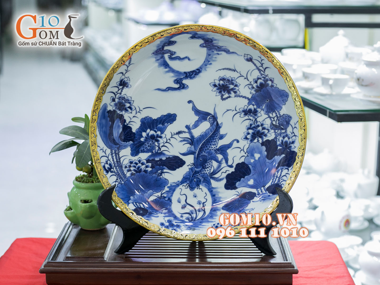 Đĩa sứ men lam vẽ cảnh Lý ngư vọng nguyệt vẽ vàng