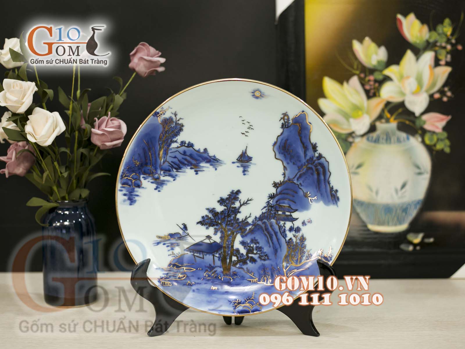Đĩa sứ men lam vẽ cảnh Sơn Thuỷ vẽ vàng 24k