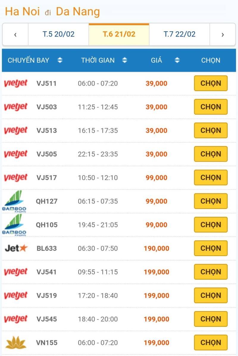Bamboo Airways khởi hành 5h45 phút sáng 21/2 là 199 ngàn đồng. Vietjet Air khởi hành 5h05 phút ngày 21/2 là 299 ngàn đồng.
