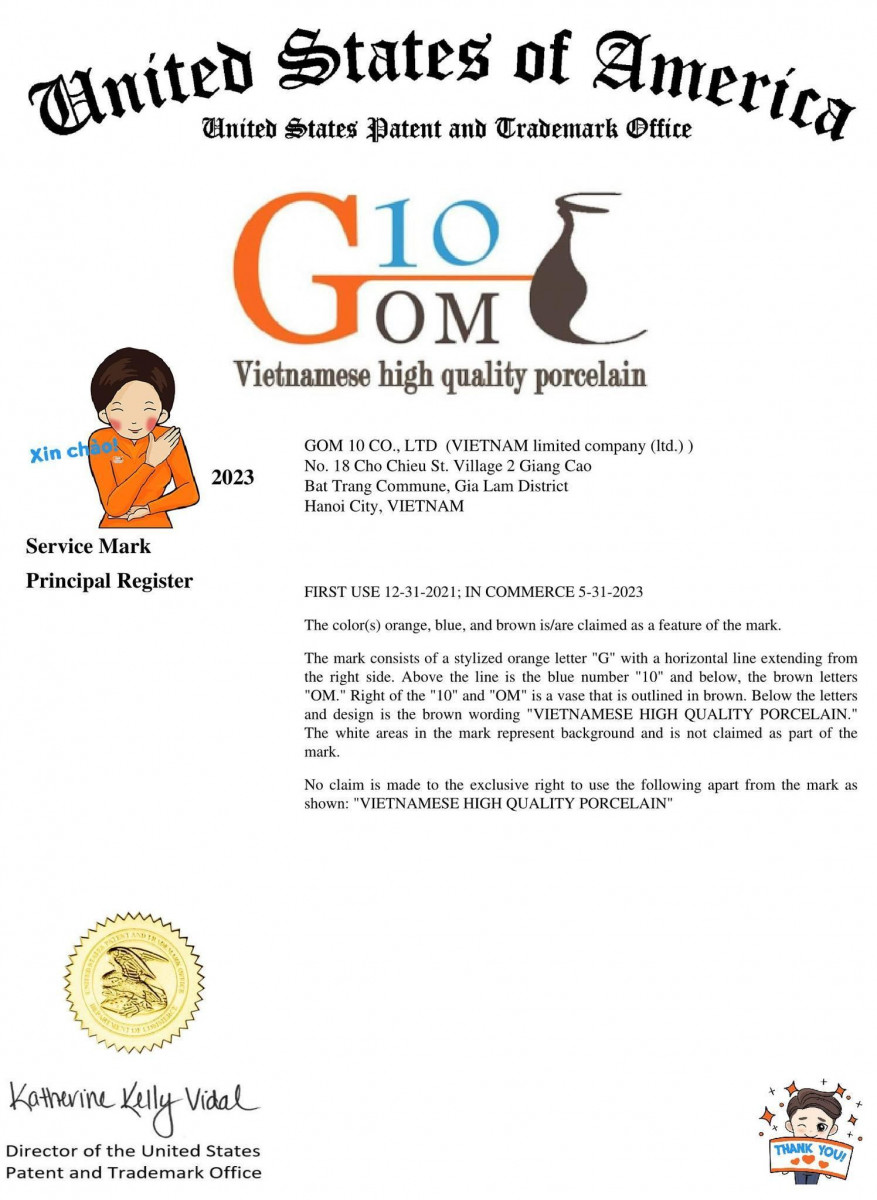 Vào tháng 09/2023, đơn đăng ký bảo hộ đã được Chấp thuận và cấp chứng nhận bảo hộ Thương hiệu Gốm 10 tại Mỹ, đây là bước khởi đầu trong sứ mệnh đưa hàng Gốm sứ thủ công Mỹ nghệ Việt Nam vươn ra thế giới.