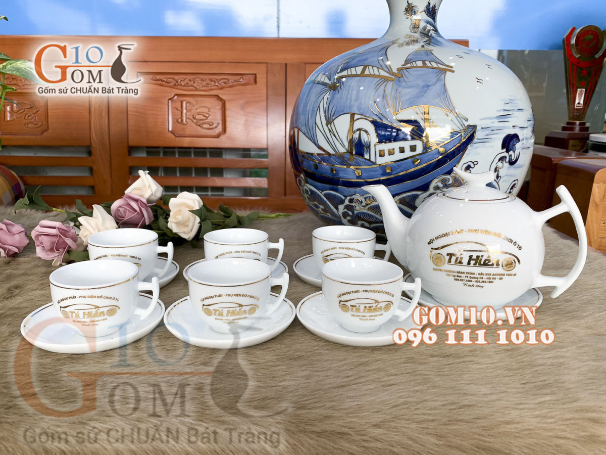 Bộ ấm chén vuông dẹt men trắng kẻ chỉ vàng kim - in logo quà tặng Ô tô Tú Hiến