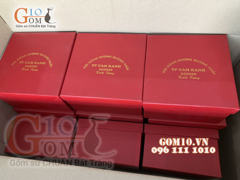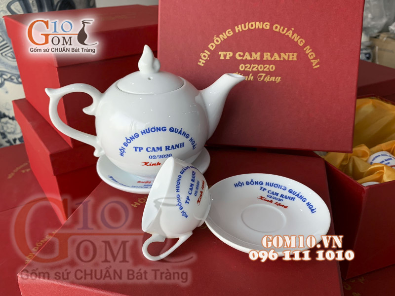 Bộ sản phẩm theo đơn đặt hàng gồm 1 bộ ấm chén sứ trắng Bát Tràng cao cấp in logo và hộp quà tặng đỏ lót si lụa sang trọng.