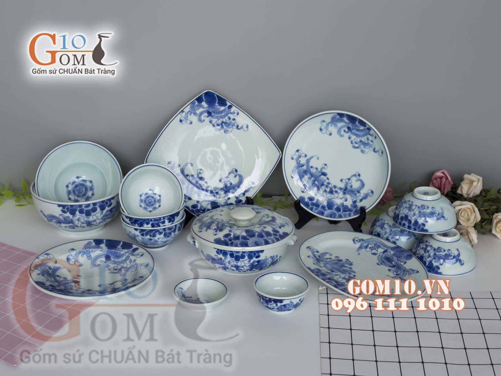 Bộ đồ ăn men lam cổ vẽ sen dây