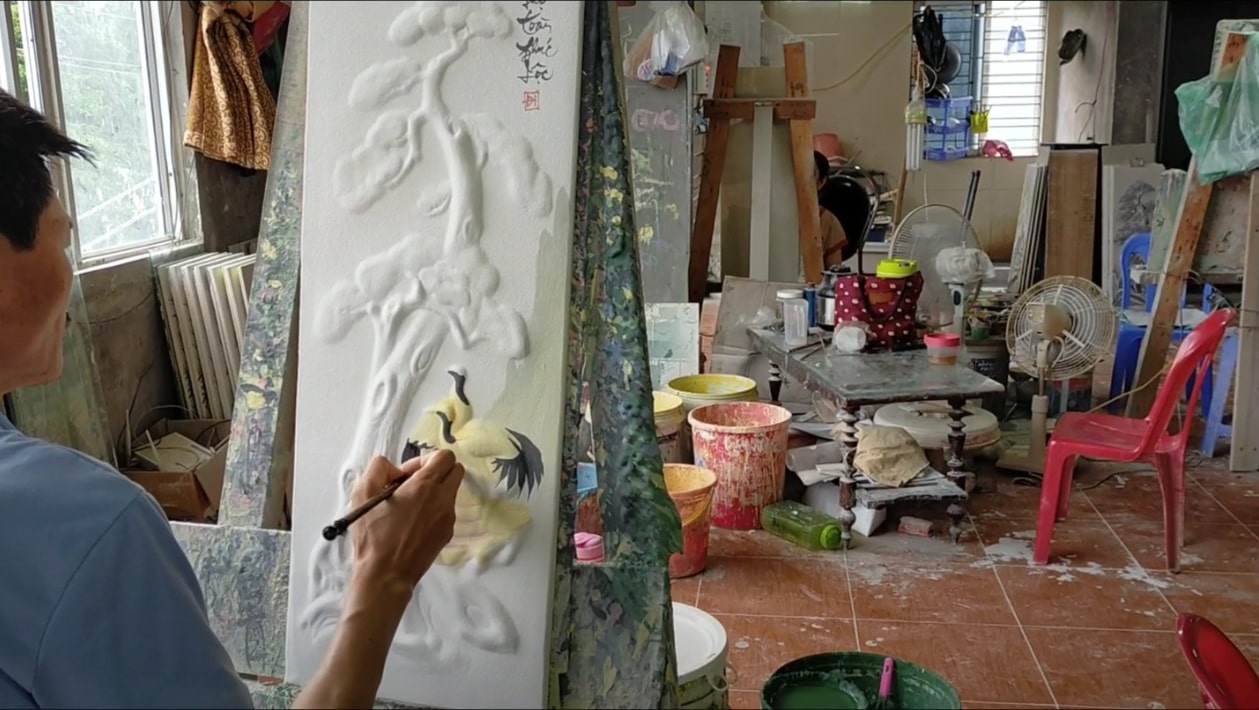 Bước 2 - Tiến hành làm phù điêu trên mặt tranh. Các họa tiết được khắc nổi. Đây là công đoạn chính mất nhiều công nhất.