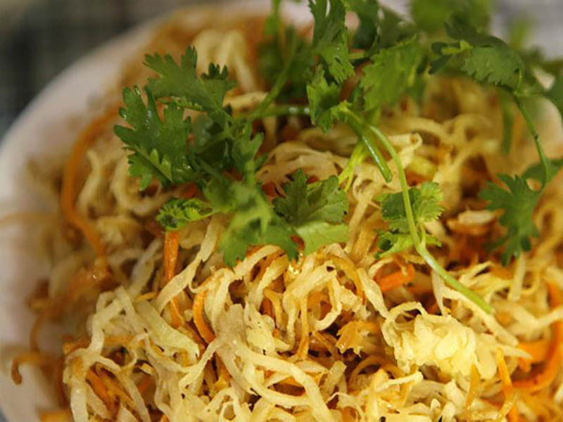 "Su hào xào mực" mới nghe tên món ăn thôi cũng khiến không ít người tò mò tại sao mực khô lại kết hợp được với su hào để tạo thành một món mực ngon ăn vừa lạ vừa quen. Quen vì su hào ai cũng biết, cũng ăn rồi và mực khô thường được nướng bằng cồn rồi nhâm nhi làm mồi nhậu. Nhưng hai thứ này mà kết hợp lại với nhau lại tạo nên cái “lạ”. Ấy vậy mà người Bát Tràng chúng tôi lại có sự kết hợp tinh tế từ những thứ tưởng như không thể thành một món ăn mang hương vị của quê mình, một món ăn không thể thiếu trong tiệc của người làng gốm.