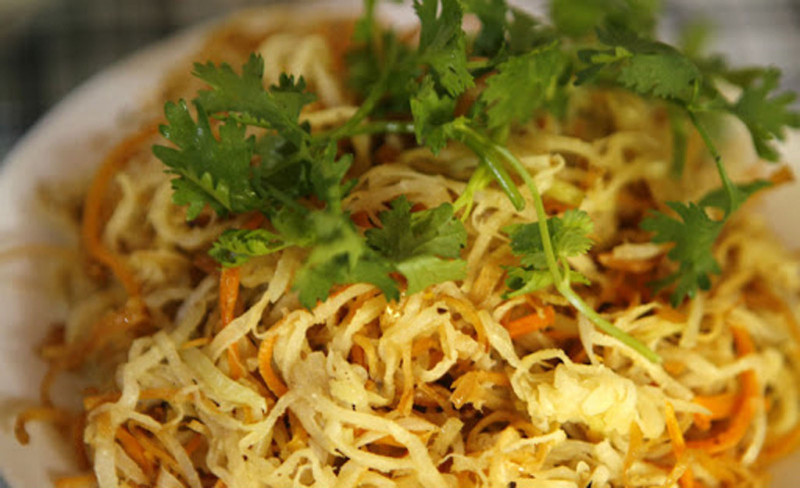 Cùng với canh măng mực thì su hào xào mực khô giòn giòn đậm vị cũng là món ăn bạn không thể bỏ qua khi đến với Làng gốm Bát Tràng.
