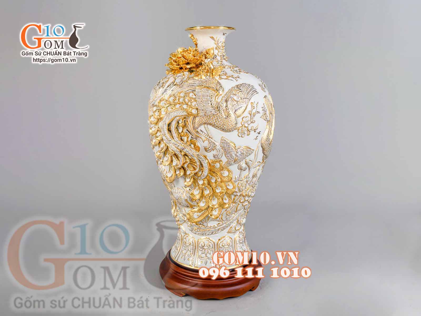 Mai bình Công Đào trắng đắp nổi vẽ vàng 24k nền vàng