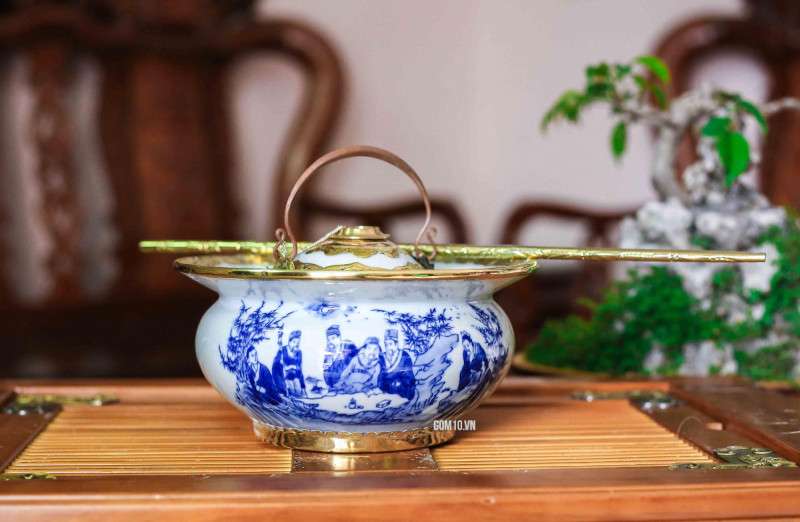 Điếu bát men lam cảnh trúc lâm thất hiền, bọc đồng Để làm chiếc điếu bát thêm nổi bật, nghệ nhân Bát Tràng đã dùng óc sáng tạo và đôi tay khéo léo tạo điểm nhấn phía ngoài sản phẩm là một lớp đồng vàng. Hoạ tiết đồng được khắc tinh tế khiến sản phẩm càng trở nên giá trị hơn.