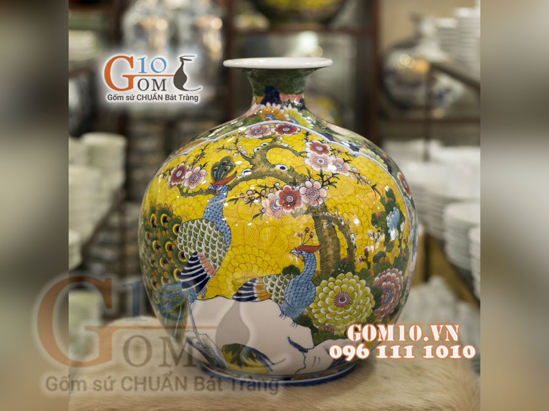 Ngoài ra, họa tiết chim công kiêu sa và lộng lẫy đại diện cho uy quyền, sự giàu sang phú quý tột độ. Đây hứa hẹn sẽ là bình tài lộc không thể thiếu trong nhà của người làm kinh doanh mệnh Kim.