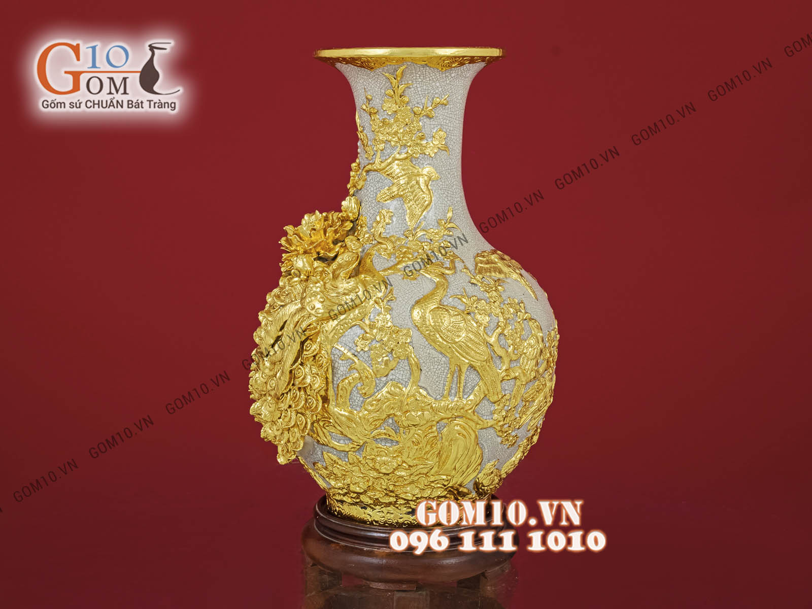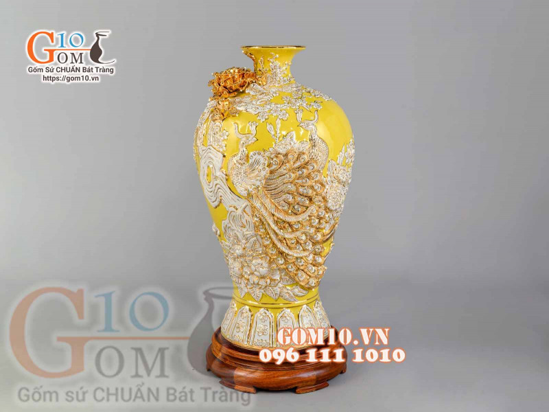 Mai bình Công Đào trắng đắp nổi vẽ vàng 24k, nền vàng 3. Gốm sứ dát vàng là gì?