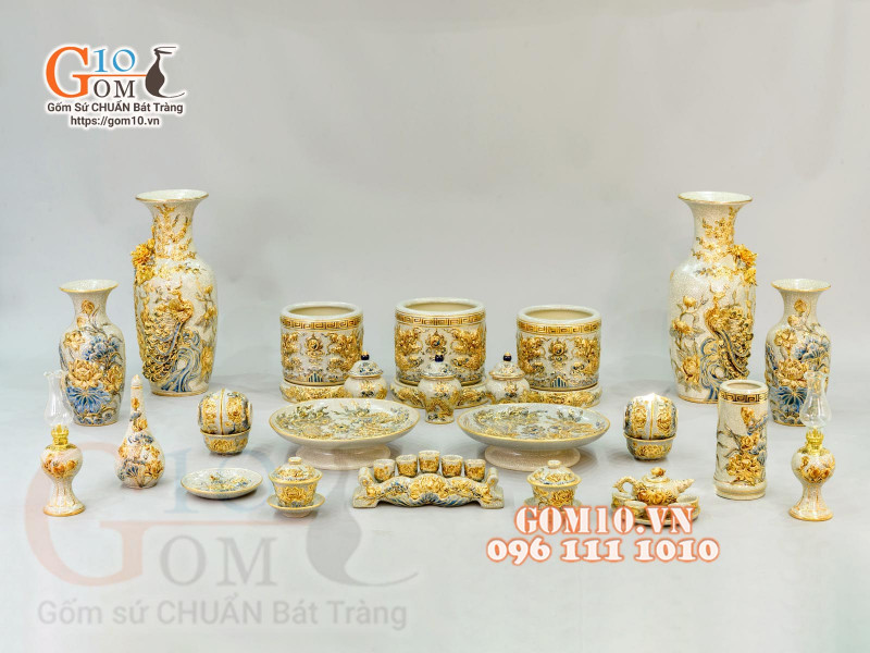 Bộ đồ thờ Phú Quý Tài Lộc men rạn đắp nổi, vẽ vàng 24k