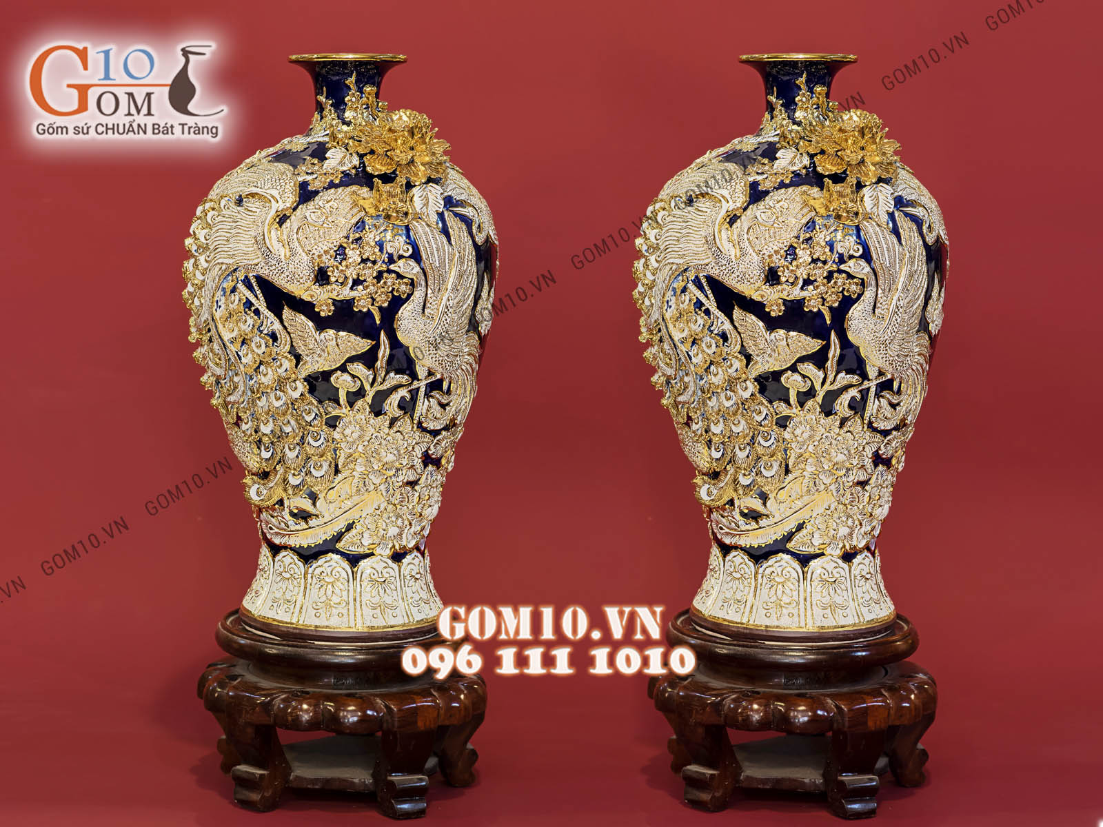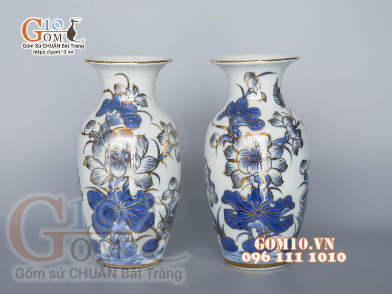 Mai bình dát vàng 24k hoạ tiết Công đào, nền xanh cô ban 6. Nên lựa chọn gốm sứ vẽ vàng hay dát vàng?