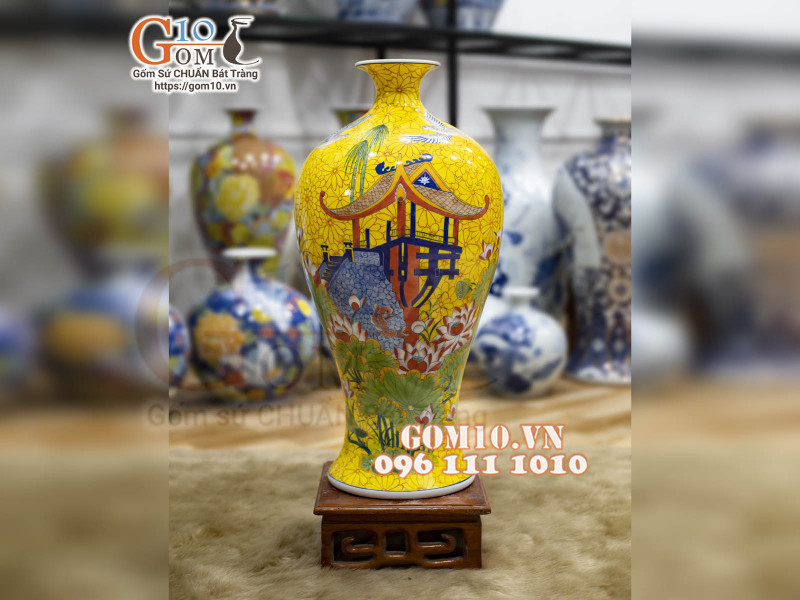 Mai bình men màu vẽ Chùa Một Cột nền vàng Tuy nhiên với các tác phẩm vẽ vàng/dát vàng kim thì công đoạn này sẽ trở nên phức tạp, tỉ mỉ, đòi hỏi độ khó hơn rất nhiều. Cụ thể, gốm sứ vẽ vàng sẽ phải trải qua các công đoạn sau: