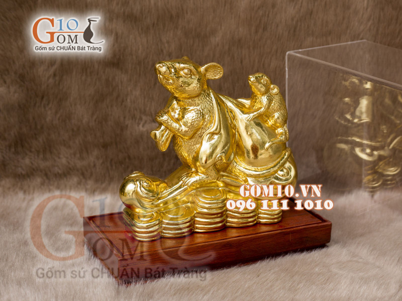 Tượng phong thủy "chuột sa chĩnh gạo" được tạo hình chuột mẹ và hai chú chuột con vây xung quanh chĩnh gạo bằng vàng.