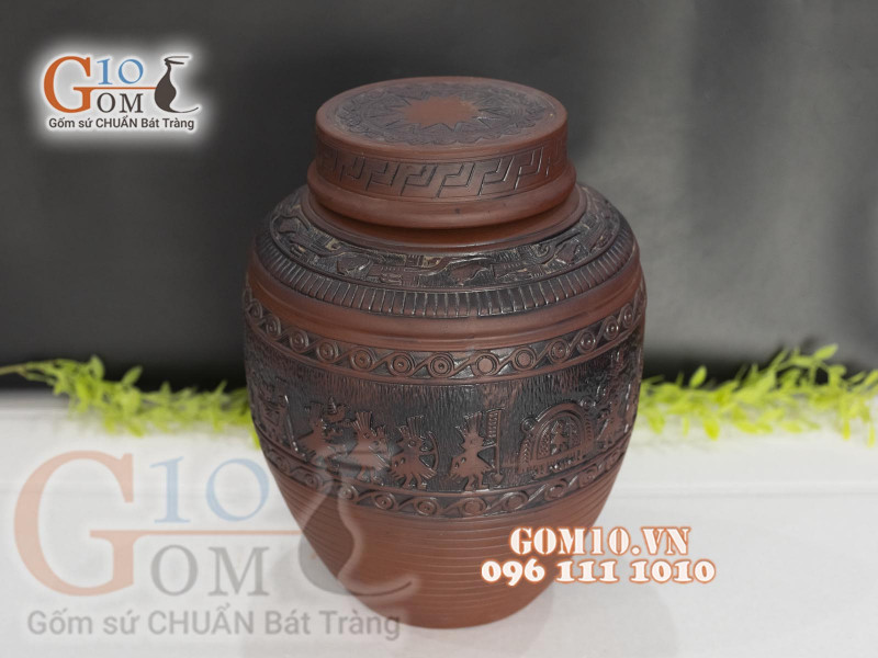 - Họa tiết đẹp: Hoa văn cũng được làm hoàn toàn thủ công từ đôi bàn tay tài hoa của các nghệ nhân. Chúng được khắc chìm, khắc nổi hay hay vẽ lên với đường nét rất uyển chuyển và sinh động. Chum sành ngâm rượu Bát Tràng không chỉ có tác dụng làm đồ chứa đựng mà còn là vật trang trí giúp tôn lên vẻ đẹp phong thủy trong nhà.