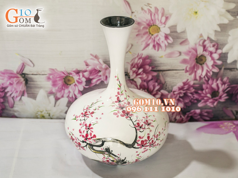 Lọa hoa sơn mài trắng dáng tỏi dẹt vẽ hoa đào
