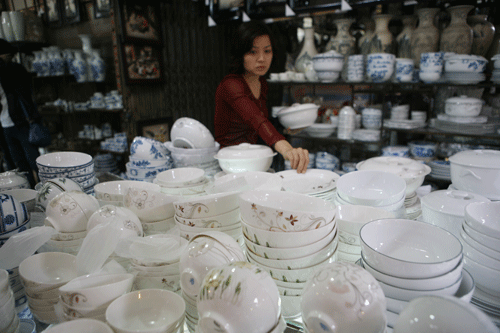 Khách hàng tấp nập đi chợ gốm Bát Tràng Khách hàng ghé thăm chợ gốm làng cổ Bát Tràng dịp Tết chủ yếu quan tâm đến các sản phẩm trang trí nhà cửa như: Lọ hoa, khay đựng bánh mứt, hoa quả, tranh gốm, tranh tứ quý... bên cạnh đó, việc sắm thêm bộ chén đĩa cho bữa cơm ngày Tết, ấm tích, bộ chén tách pha trà cho các vị khách dịp đầu xuân cũng được rất nhiều chị em phụ nữ quan tâm.