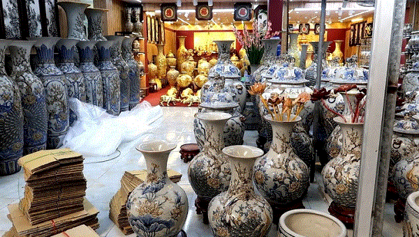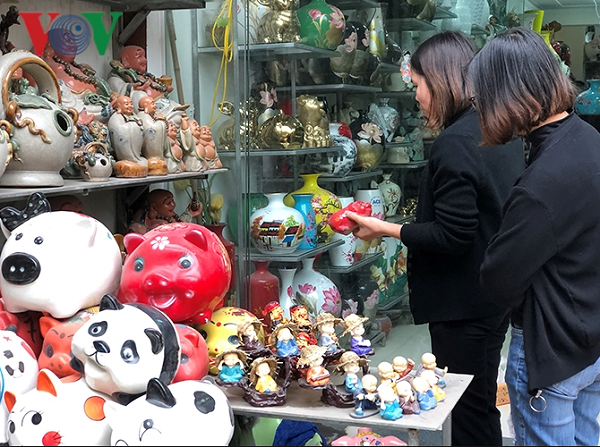 Lọ hoa được bày bán tại chợ Gốm Bát Tràng Không khí mua sắm rộn ràng đón Tết tại khu chợ gốm làng cổ Bát Tràng cũng làm các chủ gian hàng vui lây khi họ "được bận rộn" bán hàng thay vì ngồi ngóng khách như ngày thường. Chị Hà (một chủ gian hàng) không ngại chia sẻ với khách hàng quen rằng: “Bọn chị cứ thích cả năm đủ 12 tháng khách đông như thế này mới sướng, chứ như 6,7 tháng khác trong năm, buôn bán ế ẩm đến mức con ruồi bay qua chẳng muốn đuổi…”.
