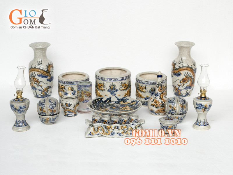 Bộ đồ thờ men rạn đắp nổi rồng vàng S3 - Bộ đồ thờ dành cho kích thước ban thờ 48 x 89 cm - Hỷ Sự Nạp Phúc, bao gồm 14 món, trong đó có 3 bát hương.