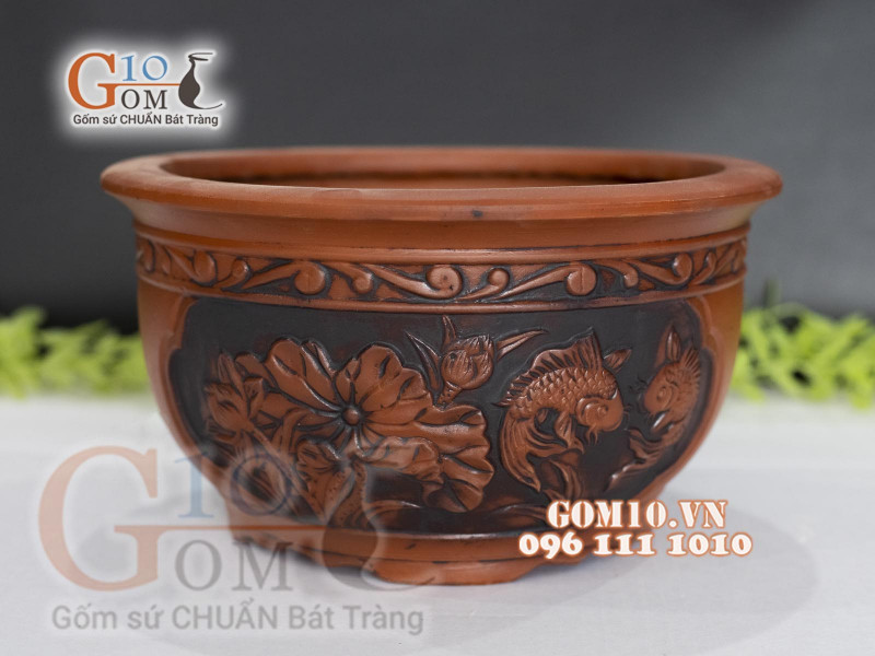 Chậu cây gốm Bát Tràng mộc mạc, bình dị, dễ dàng hòa hợp với màu sắc của thiên nhiên cây cỏ. Trên thân chậu được khắc nổi những họa tiết đậm đà chất liệu dân gian Việt Nam vô cùng đặc sắc.