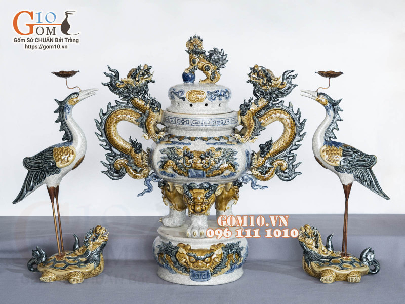 - Bộ đỉnh hạc: hay còn gọi là bộ tam sự gồm: đỉnh sứ, đôi hạc (hoặc chân nến), khác với bộ ngũ sự gồm đầy đủ đỉnh sứ, đôi chân nến, đôi hạc thờ. Đỉnh hạc được đặt ở chính giữa bàn thờ đằng trước hoặc bên dưới bài vị tổ tiên với ý nghĩa mang lại nhiều cơ hội may mắn, có khả năng tránh tà khí và phù hộ cho con cháu trong gia đình. Tùy theo tài chính của gia chủ mà lựa chọn bộ tam sự hoặc bộ ngũ sự để thờ cúng.