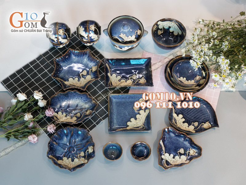 Bộ đồ ăn men hỏa biến xanh đá khắc sen