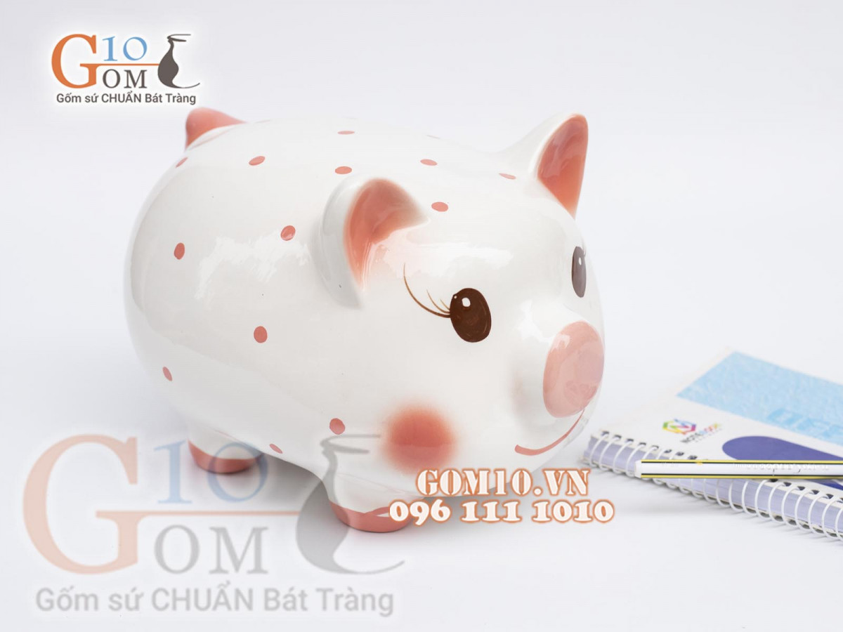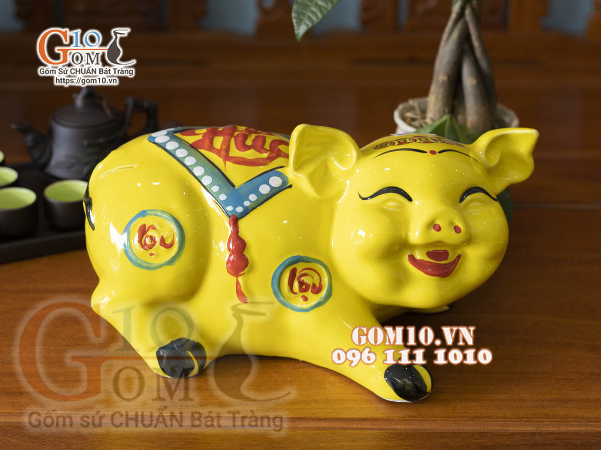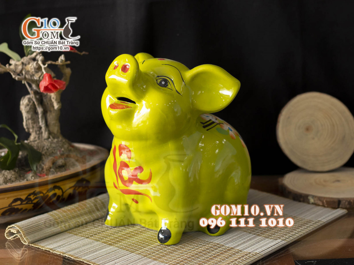 Con heo đất có hình dáng đầu tròn được làm bằng nguyên liệu sứ của làng nghề gốm, có nhiều màu sắc khác nhau, trên lưng có một đường xẻ vừa vặn để thả những đồng xu hay những phong bao lì xì.