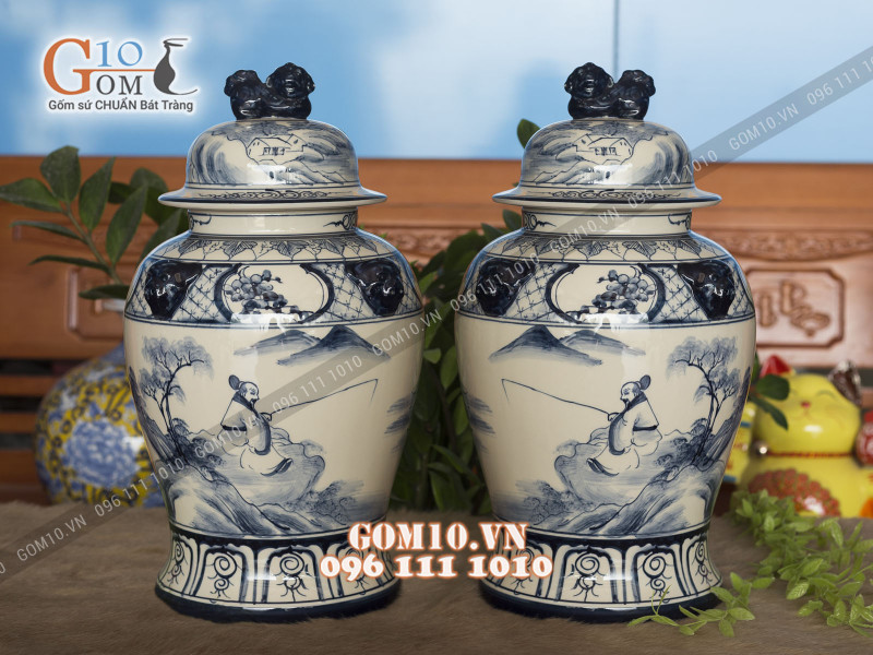 Đôi chóe men bóng vẽ cảnh Lã Vọng Câu Cá Đĩa trang trí