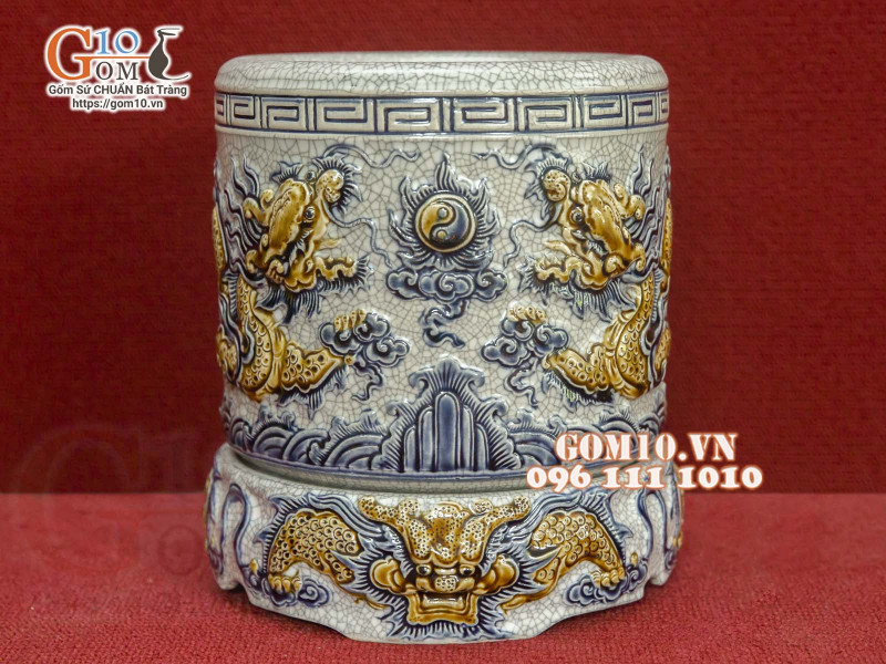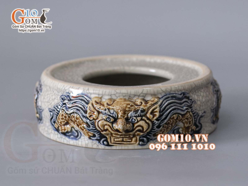 Một trong những mẫu chân kê bát hương được ưa chuộng nhất hiện nay. Đặc điểm nổi bật của dòng sản phẩm này là được tráng với nhiều lớp men. Nổi tiếng là chân kê bát hương men rạn với hoa văn đắp nổi rất lạ mắt.