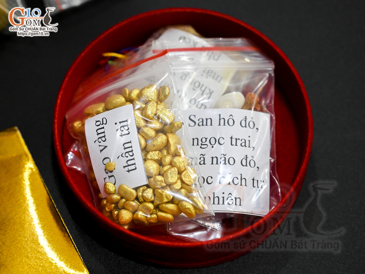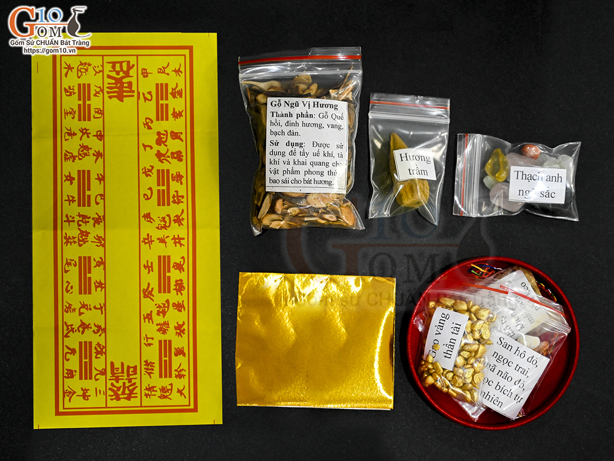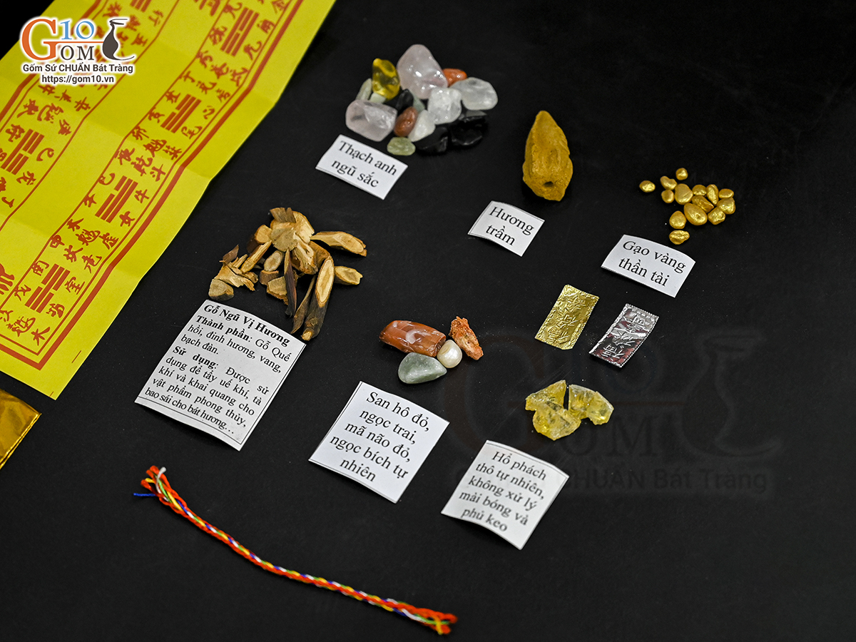 Bộ cốt thất bảo tại Gốm 10 được chuẩn bị vô cùng tinh tươm và đầy đặn với mong muốn là giúp gia chủ có được nhiều phú quý và tài lộc. Trong phong thủy thì bộ cốt thất bảo được coi là linh ứng vô cùng quan trọng , hội tụ linh khí đất trời trải qua hàng trăm năm mới có thể có được.