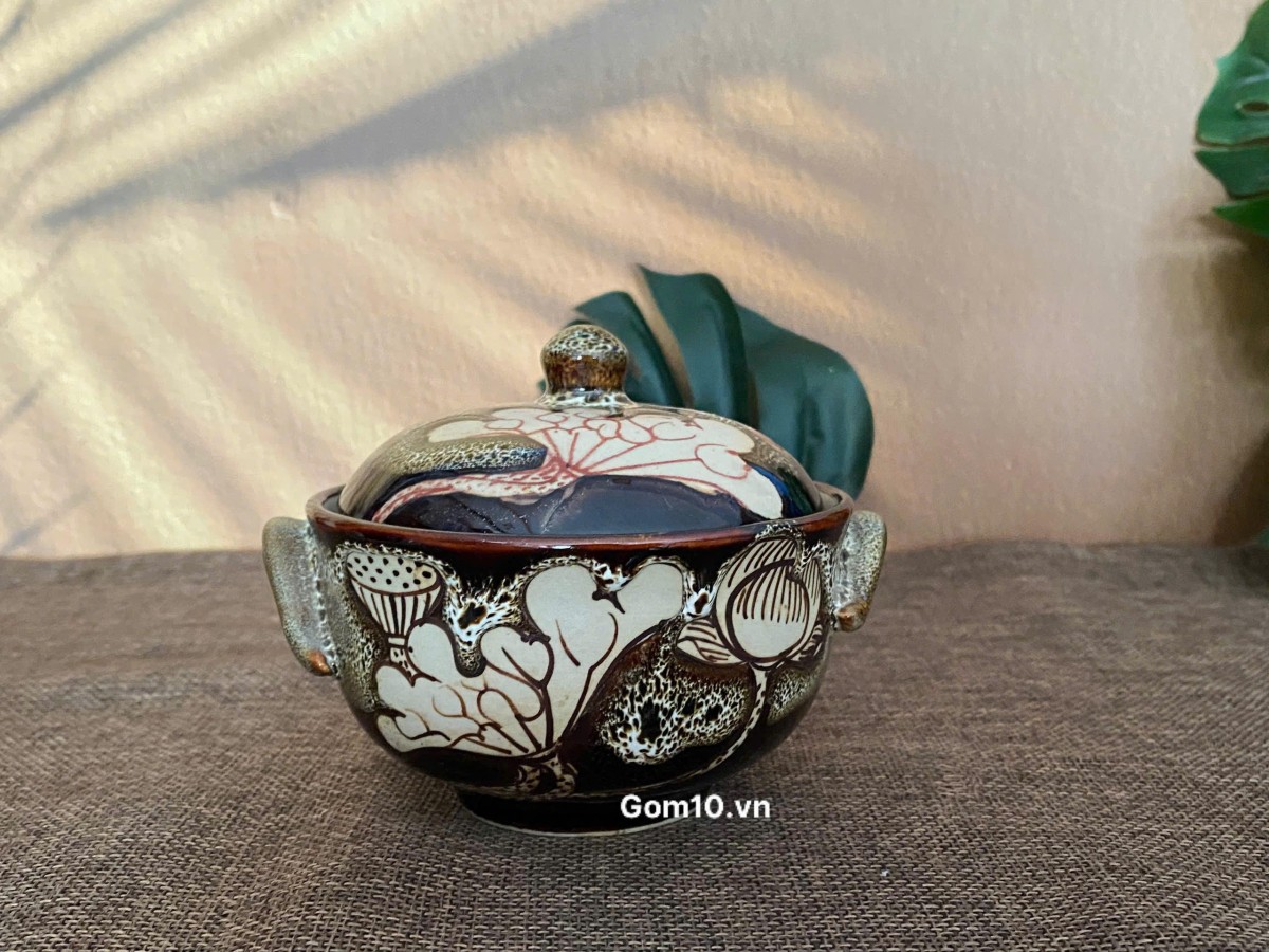 Bát cơm nắp có tai men hoả biến gấm vàng khắc sen , đường kính 10,5cm