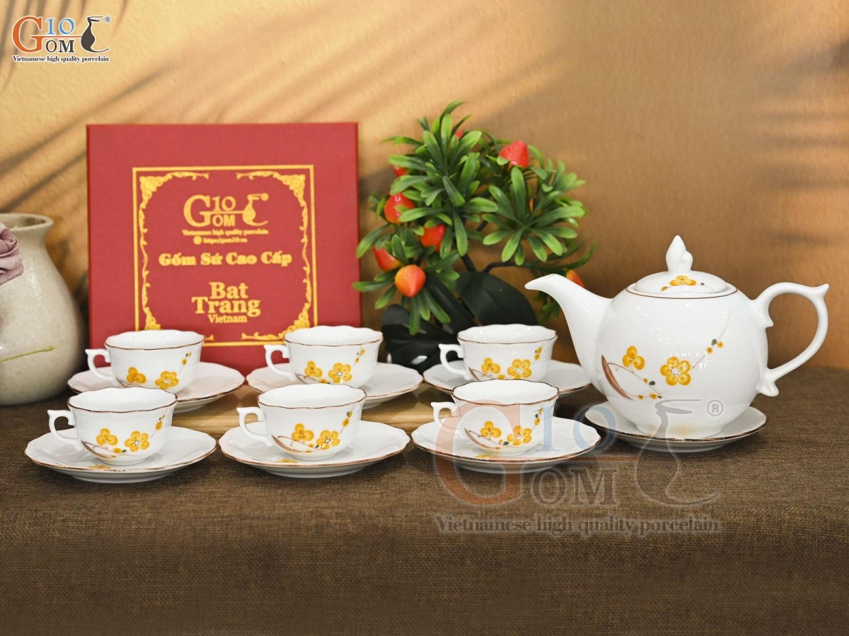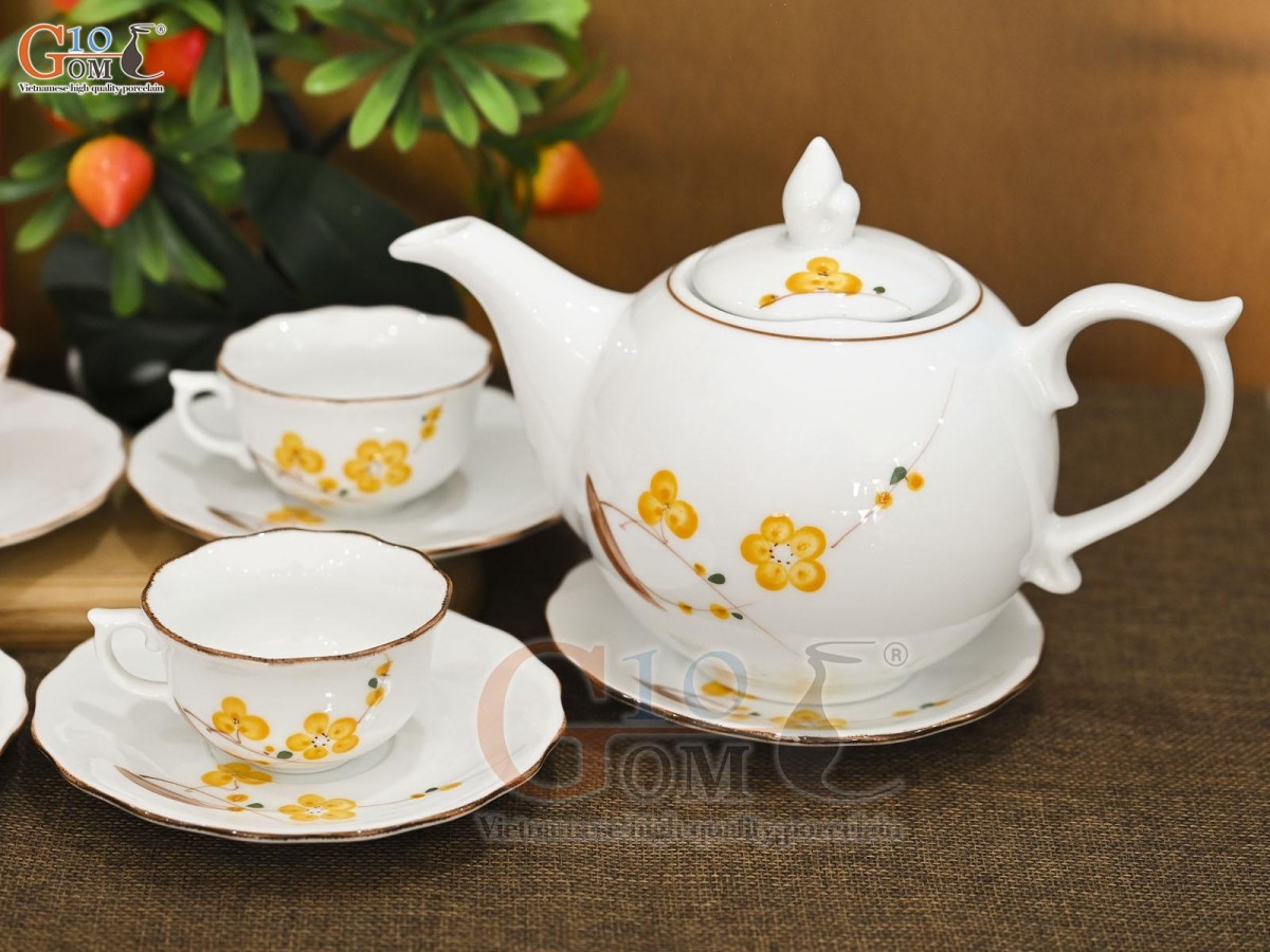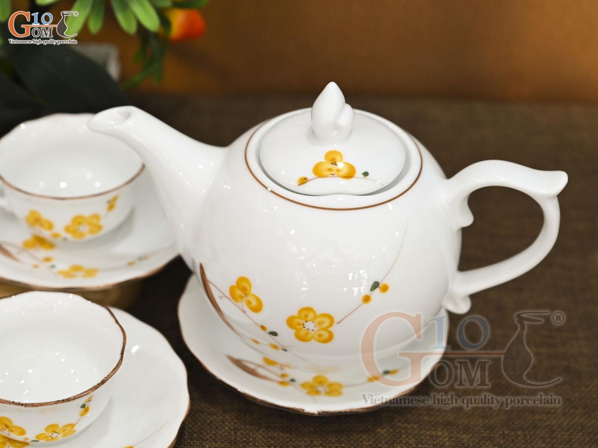 Bộ ấm chén mẫu đơn men trắng vẽ hoa Mai vàng, 650ml