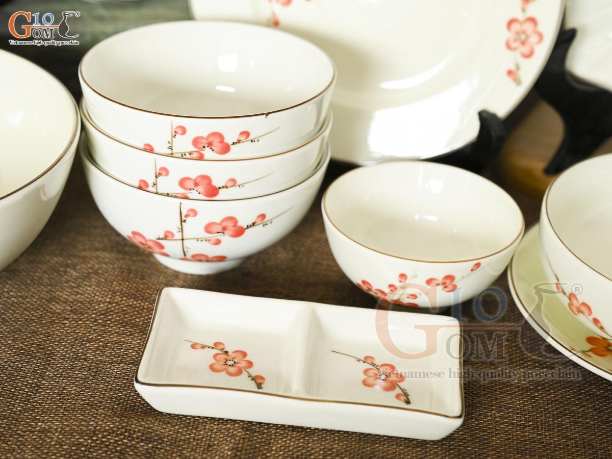 Bát mắm men kem vẽ hoa Đào đỏ |