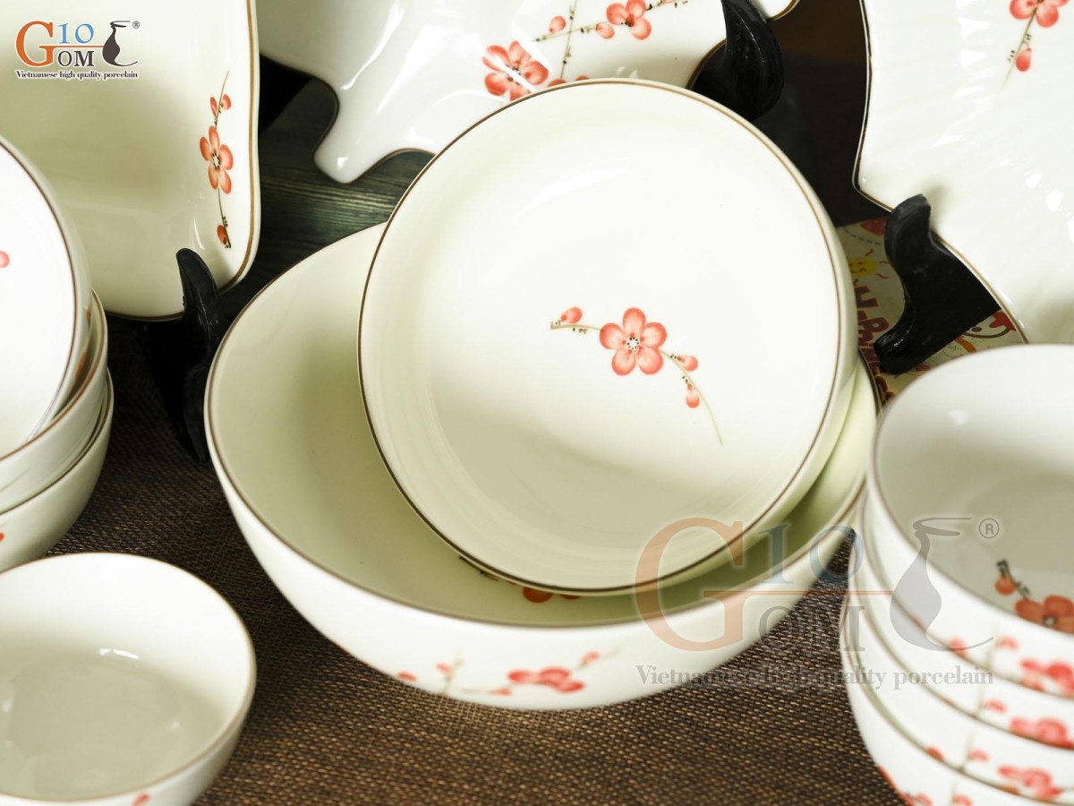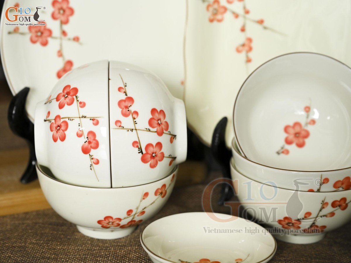 Bát tô men kem vẽ hoa đào đỏ, 18cm |