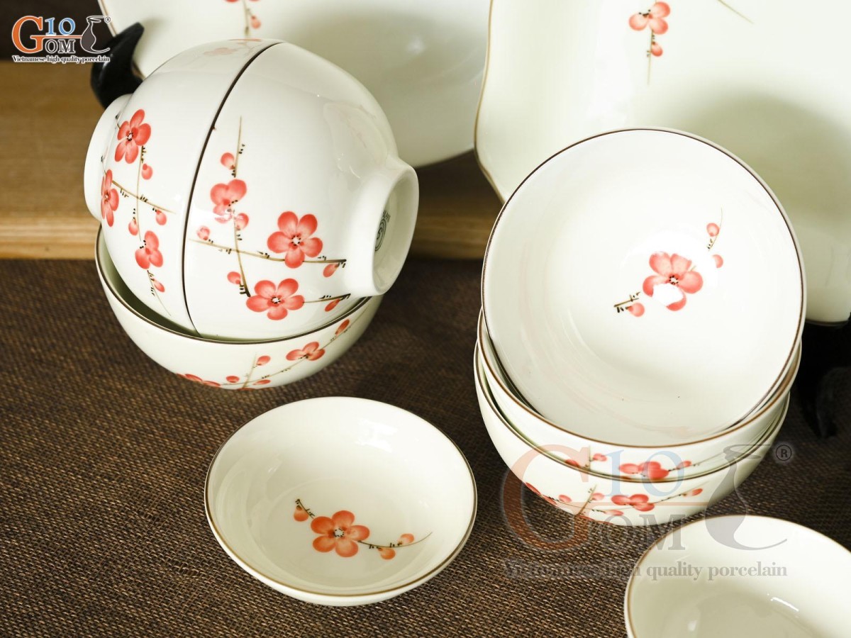 Bát mắm men kem vẽ hoa Đào đỏ |