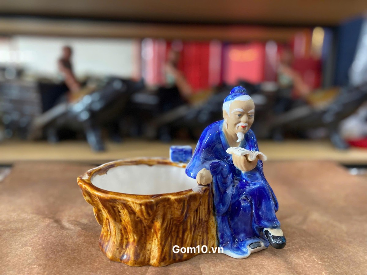 Chậu tượng trồng cây Thần Trà đọc sách màu xanh coban, cao 16cm