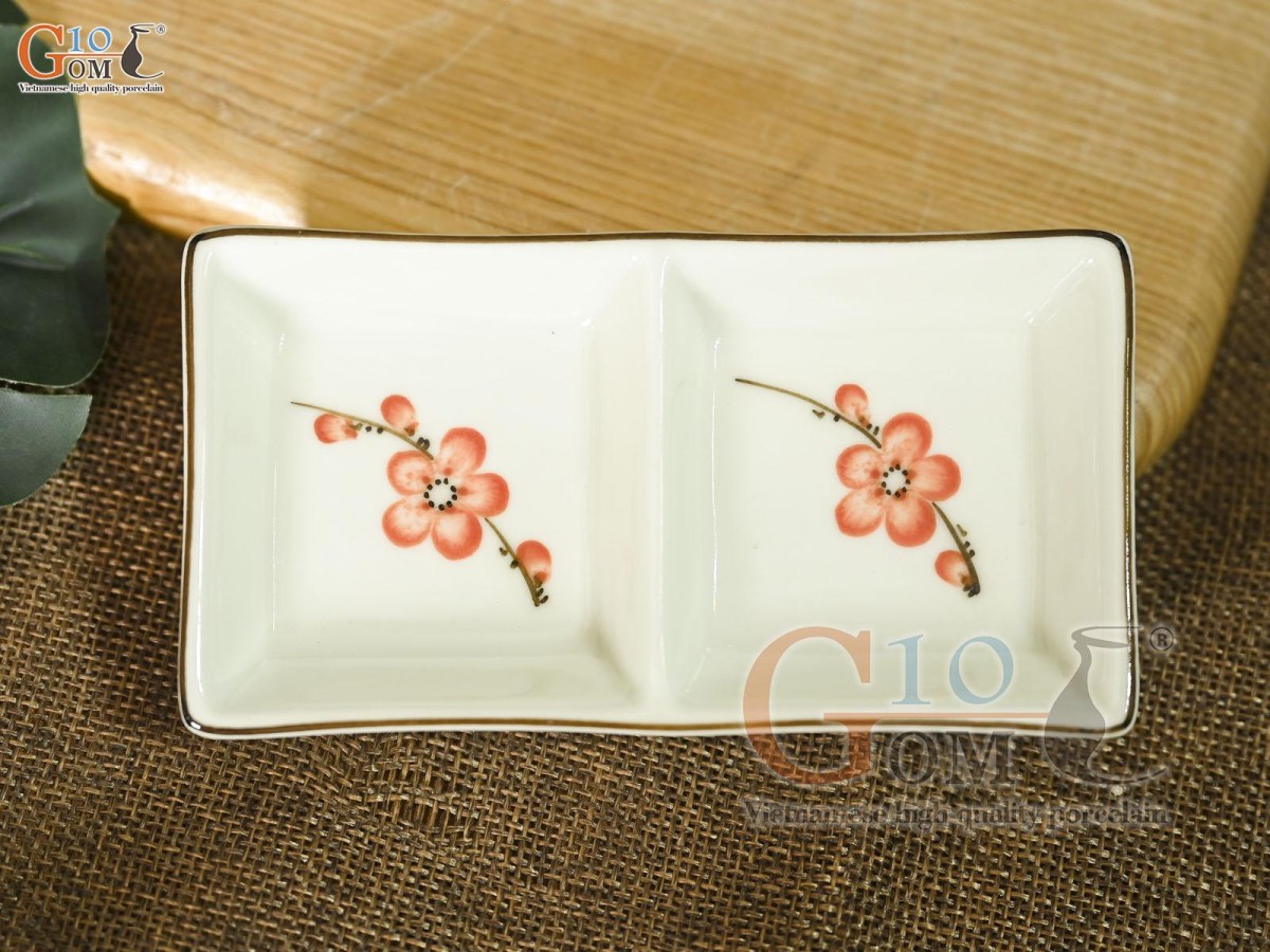 Đĩa gia vị 2 ngăn men kem vẽ hoa Đào đỏ