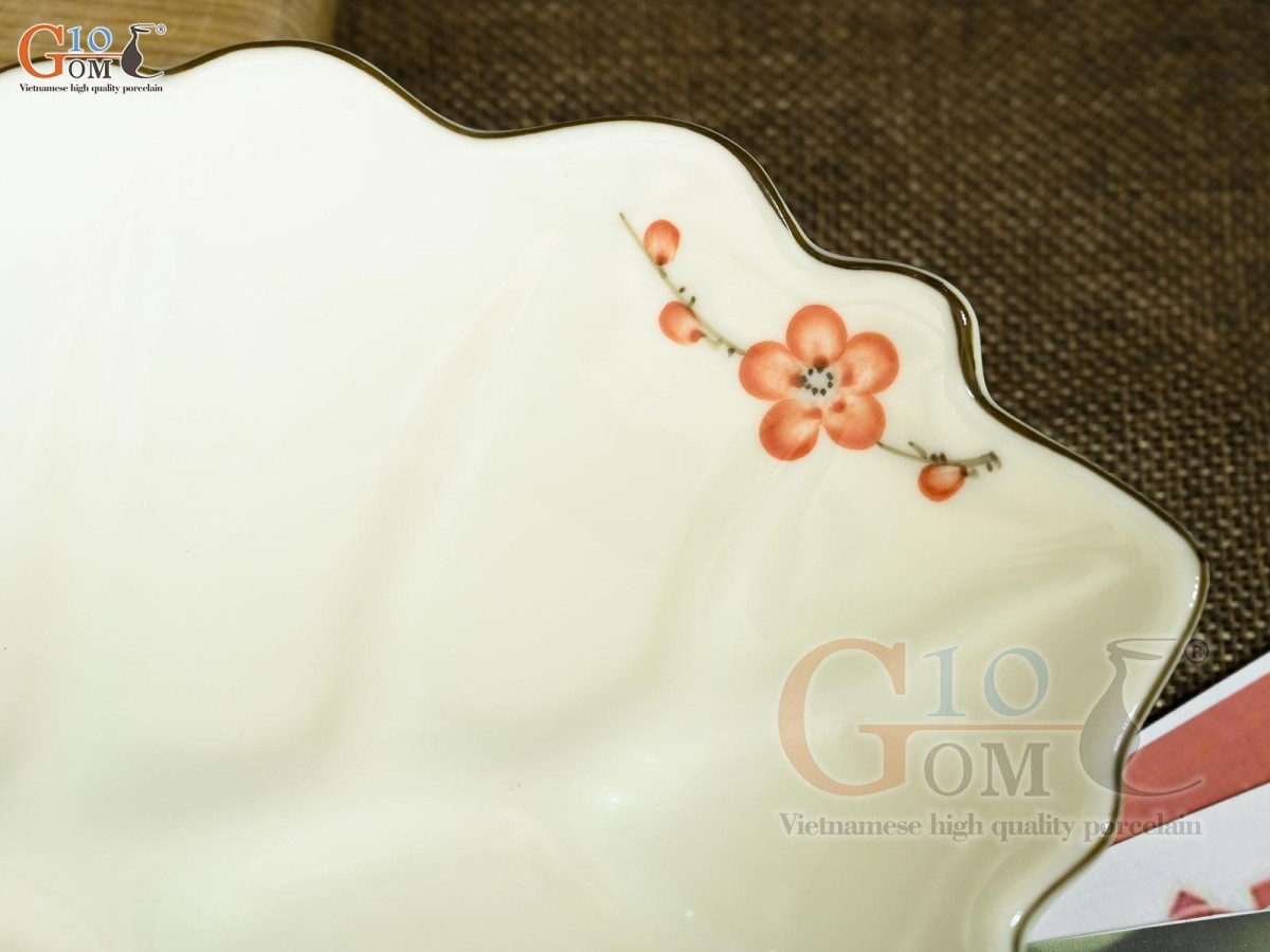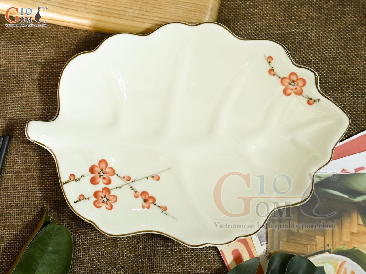 Đĩa lá sâu men kem vẽ hoa Đào đỏ, 25x18cm Đĩa lá sâu men kem vẽ hoa Đào đỏ, 25x18cm Đĩa lá sâu men kem vẽ hoa Đào đỏ, 25x18cm