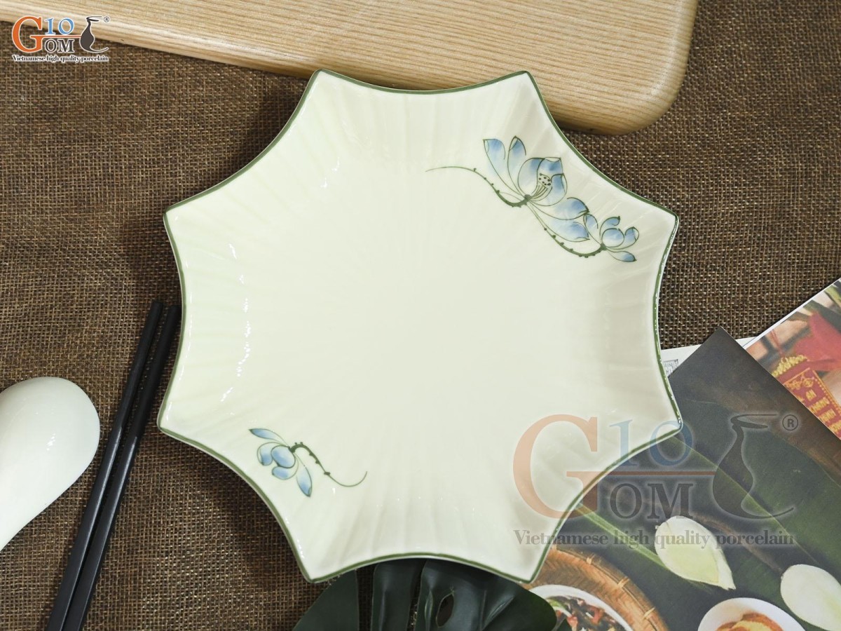 Đĩa sao men kem vẽ hoa Sen xanh, 24cm