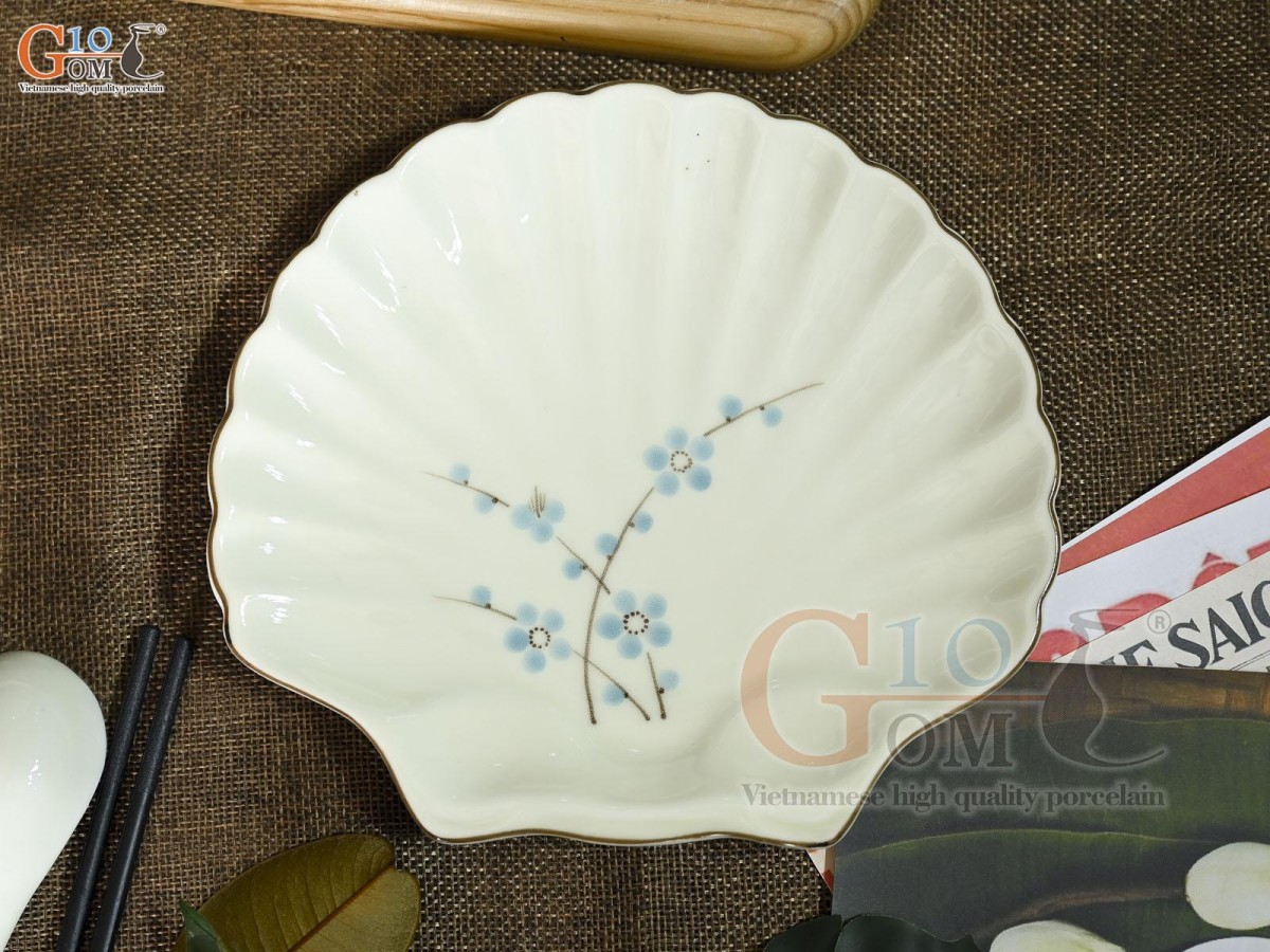 Đĩa sò men kem vẽ hoa Đào xanh, 23x20cm