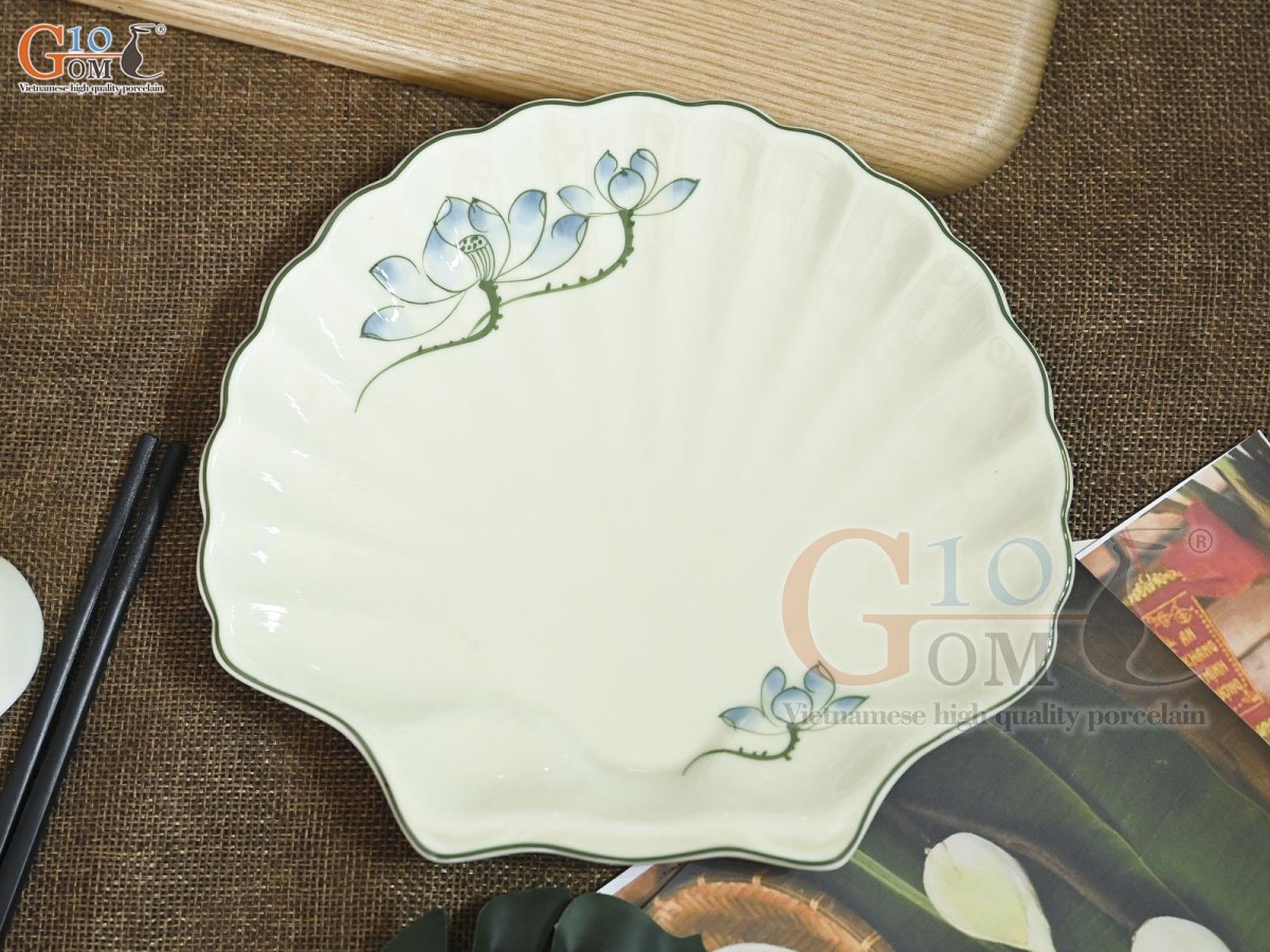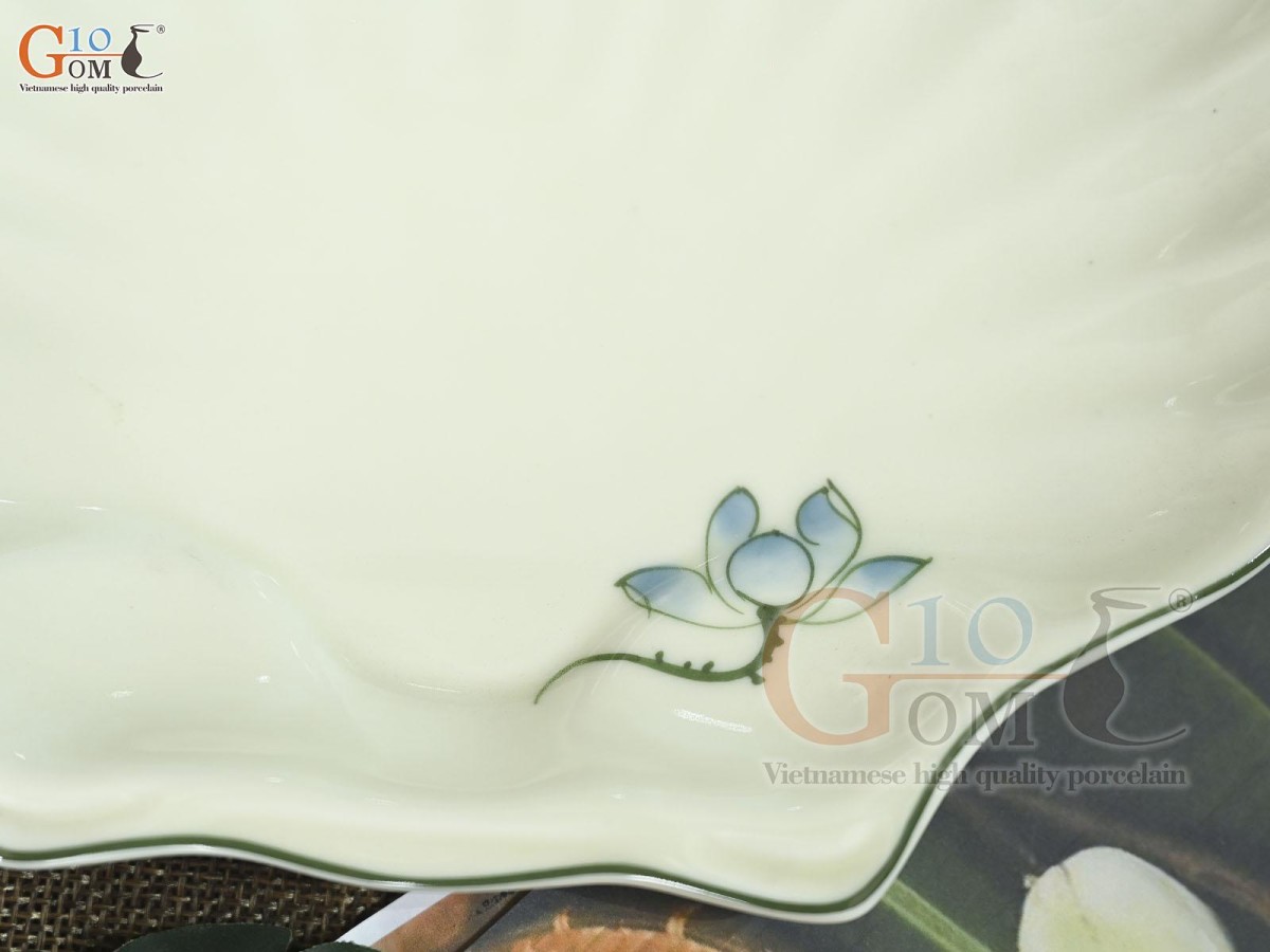 Đĩa sò men kem vẽ hoa Sen xanh, 23x20cm Đĩa sò men kem vẽ hoa Sen xanh, 23x20cm Đĩa sò men kem vẽ hoa Sen xanh, 23x20cm
