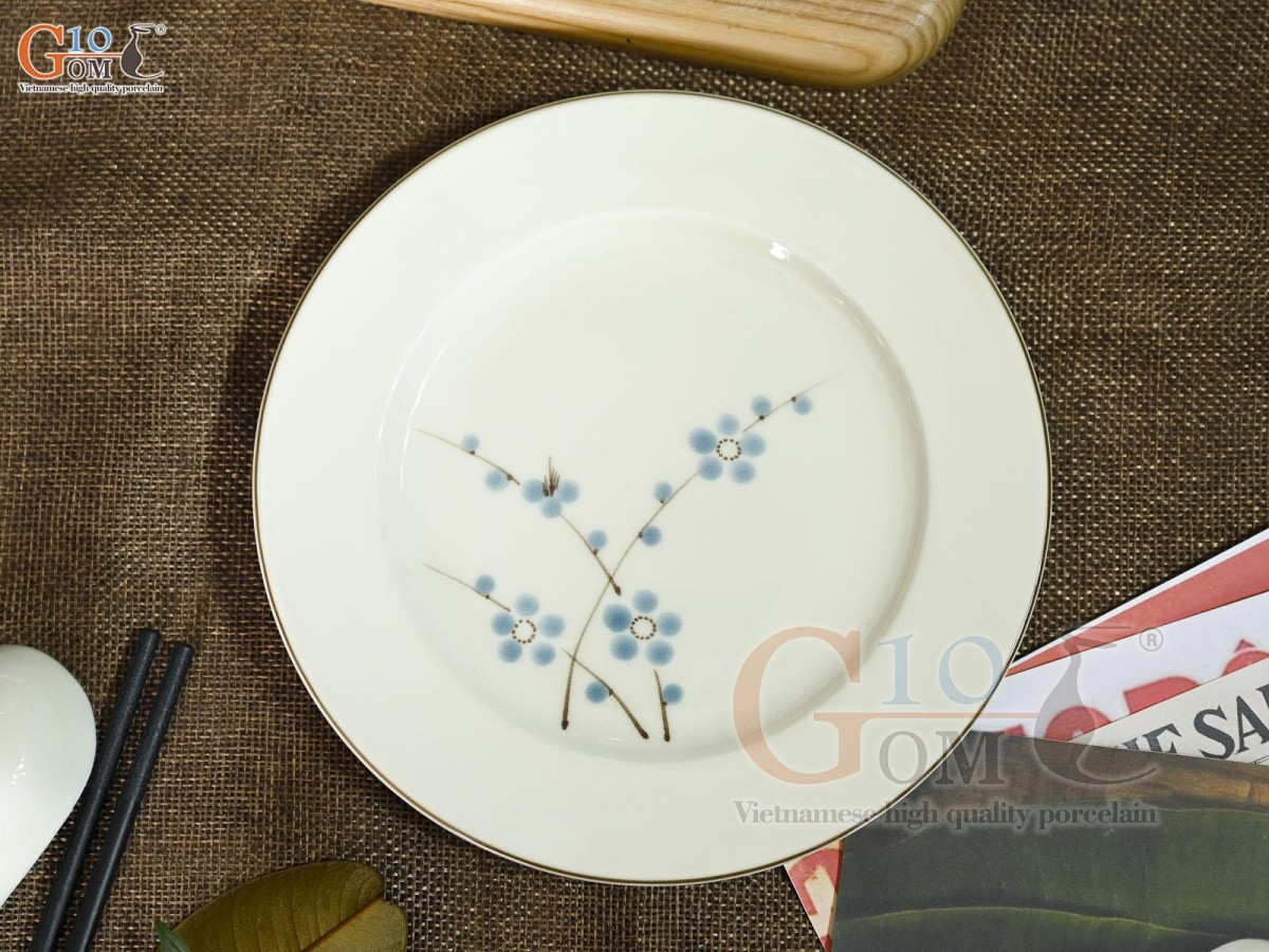 Đĩa tròn 2 viền men kem vẽ hoa Đào xanh, đường kính 24cm Đĩa tròn 2 viền men kem vẽ hoa Đào xanh, đường kính 24cm