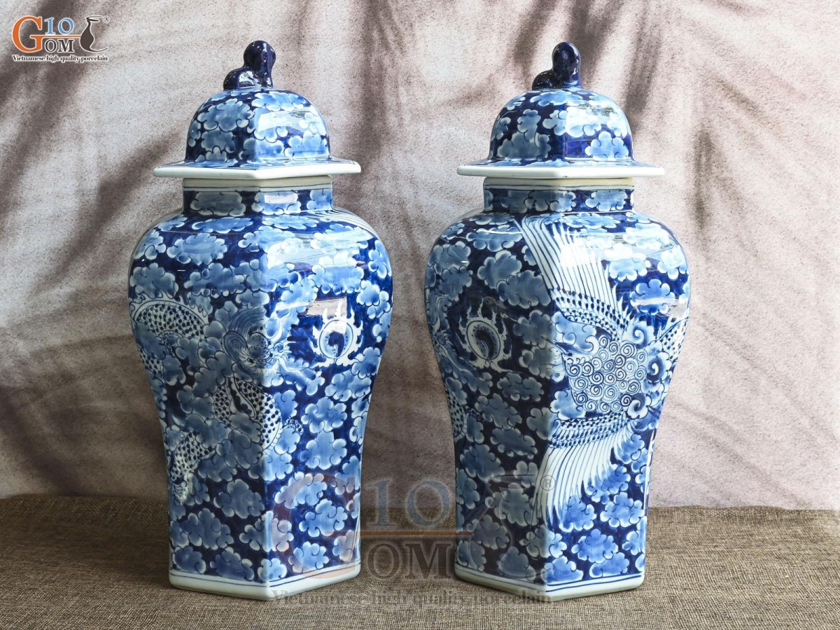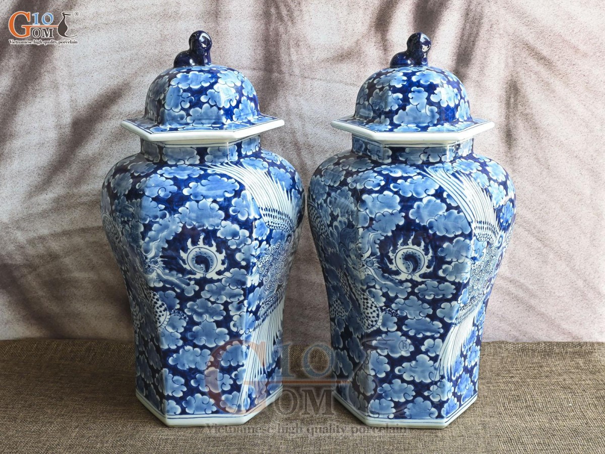 Đôi chóe lục giác men lam cổ vẽ Long ẩn nền băng, cao 41cm