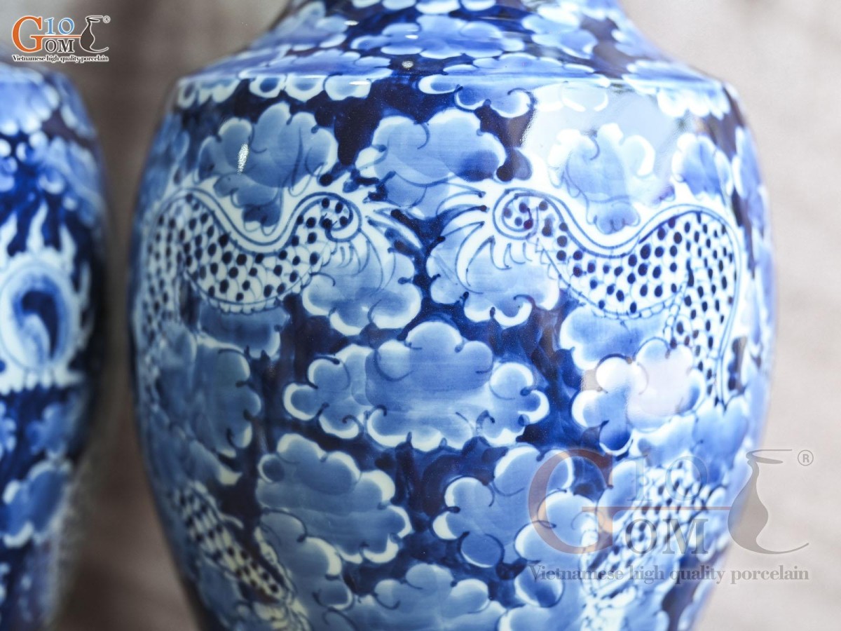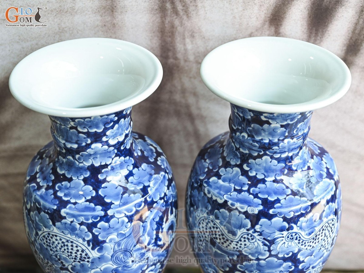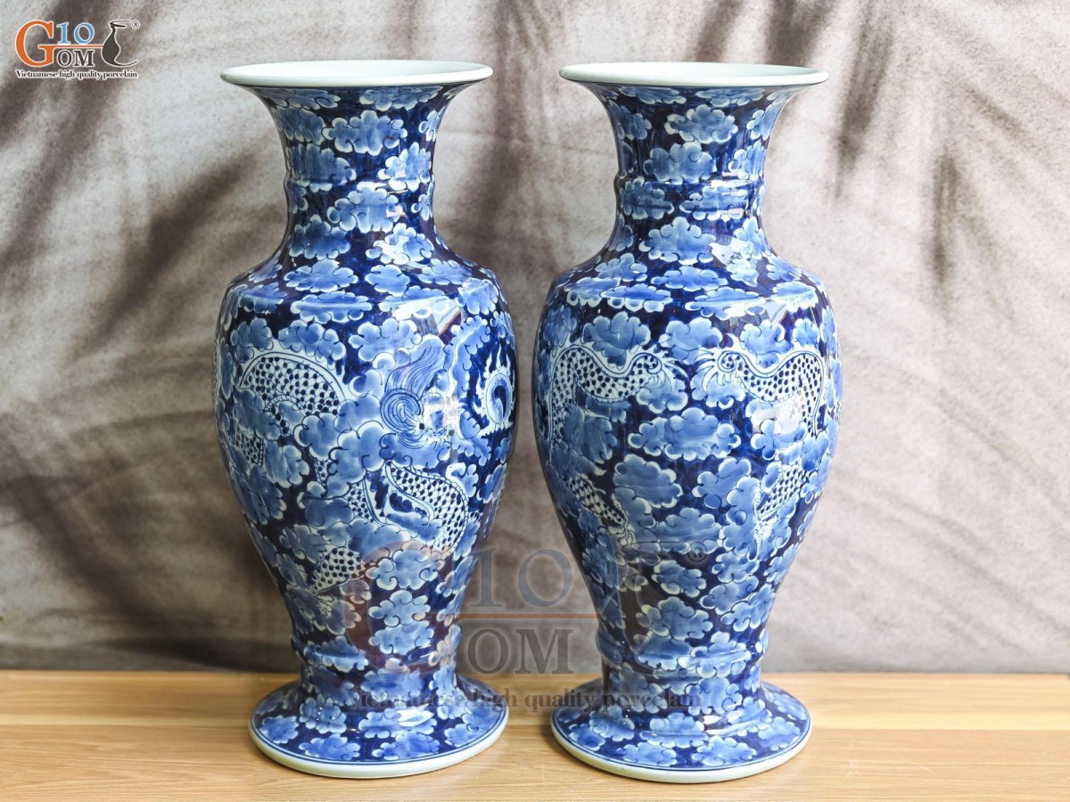 Đôi lọ hoa chân váy Long Ẩn men lam cổ nền băng, cao 41cm