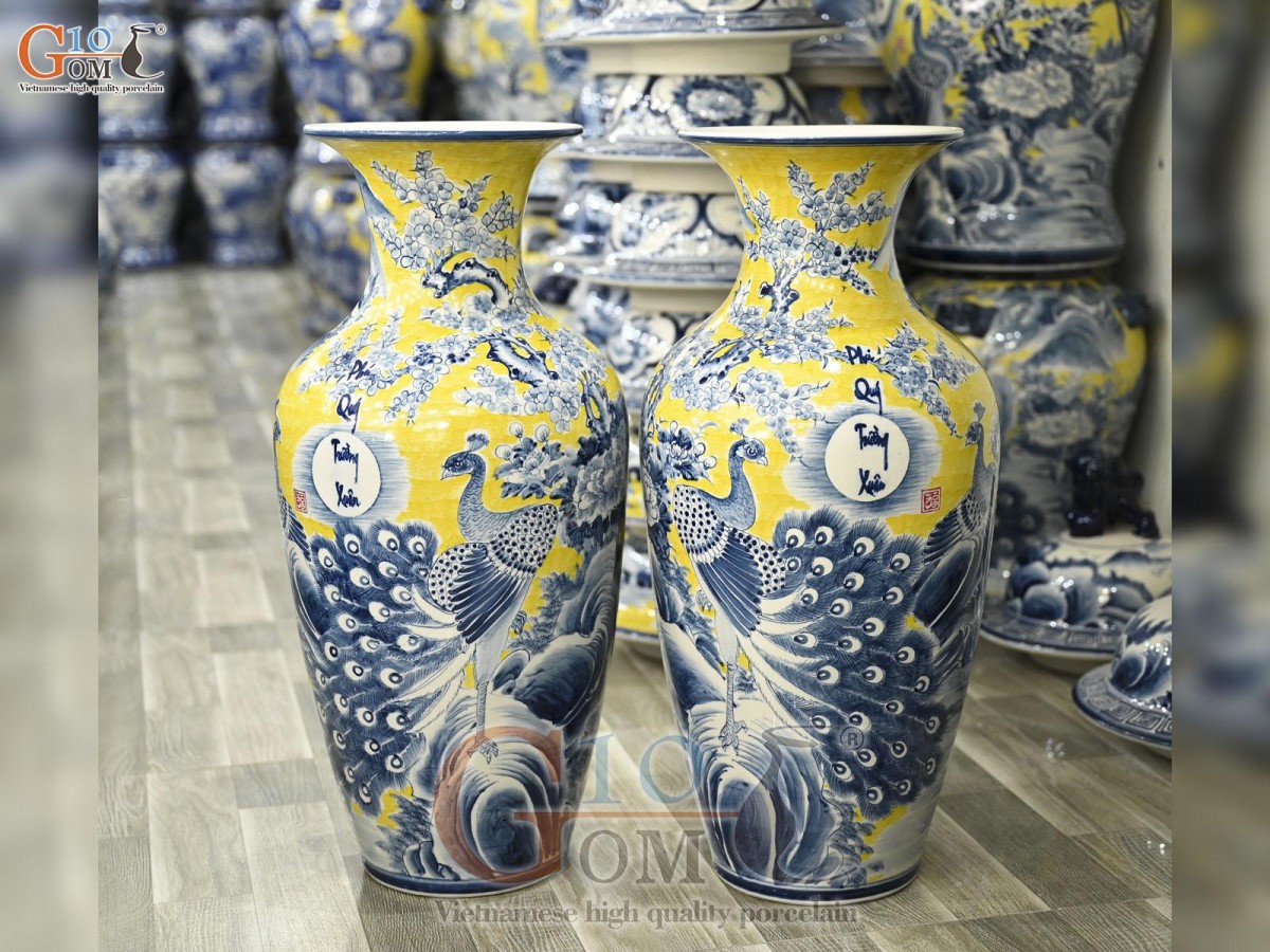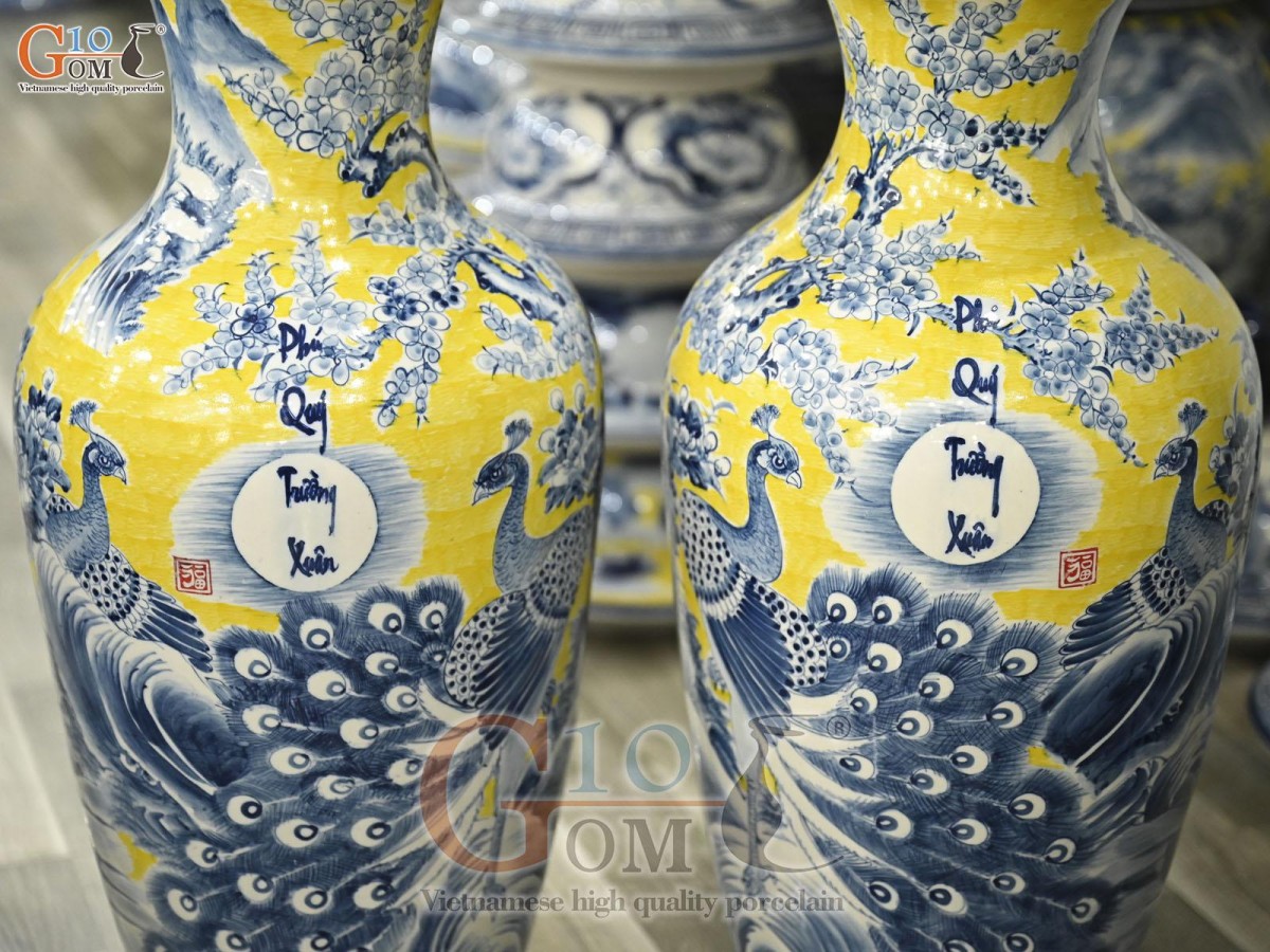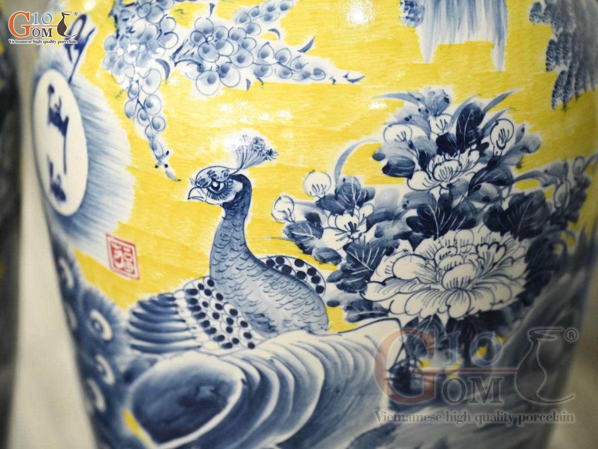 Đôi lộc bình men màu vẽ Phú Quý Trường Xuân nền vàng, cao 70cm