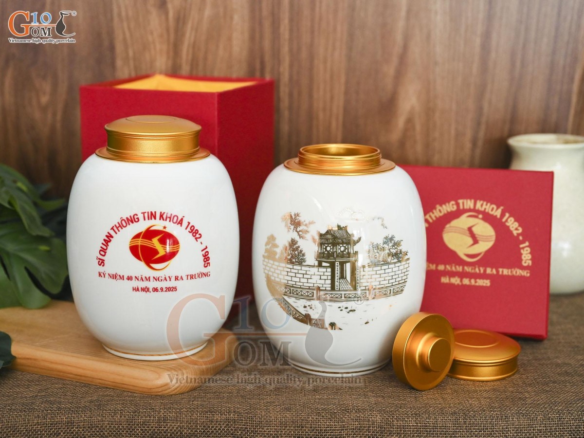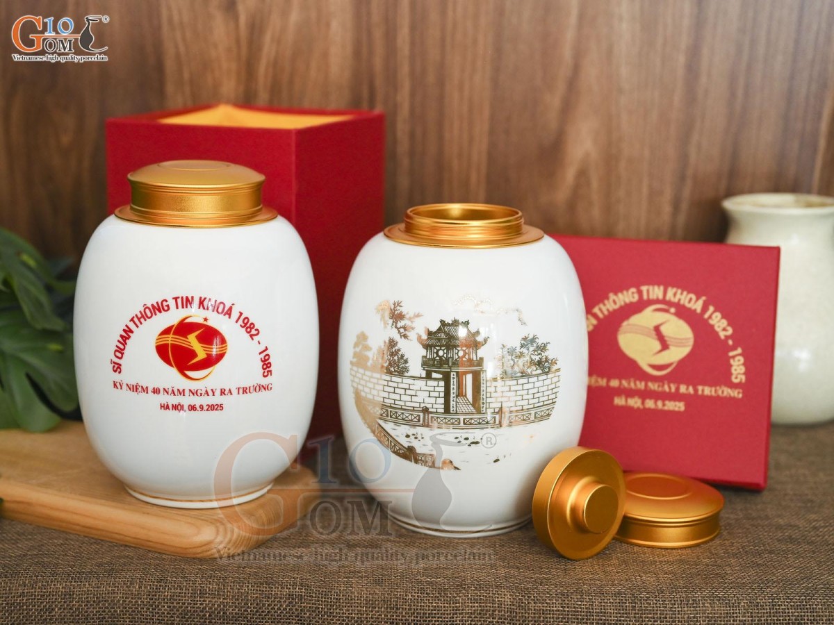Lọ chè men trắng nắp kim loại dáng bom, họa tiết Khuê Văn Các in logo
