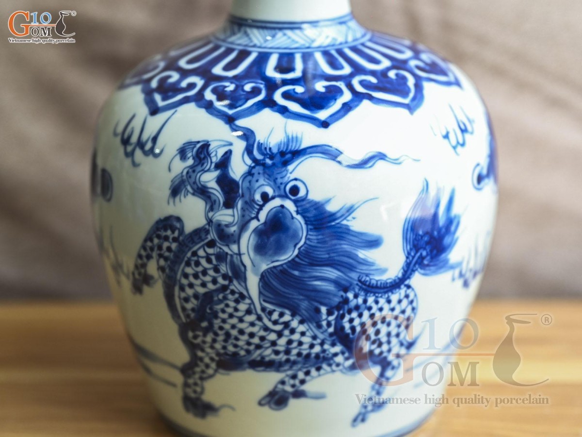 Lọ hoa dáng nậm to men lam cổ vẽ Nghê, cao 30cm