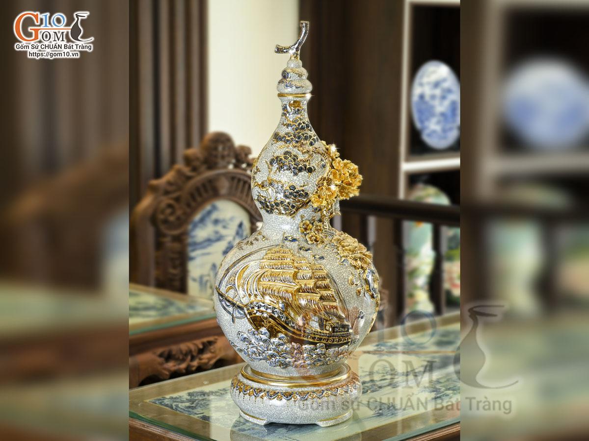 Vật phẩm Hồ Lô là một trong những vật phẩm phong thủy hàng đầu giúp giải trừ tà ma, phòng tránh tiểu nhân, hấp thu tài lộc cho chủ nhân. Hình dáng bầu hồ lô đơn giản nhưng sử dụng chất liệu gốm sứ cao cấp để chế tác. Trên hồ lô trang trí nhiều họa tiết tinh tế, gần gũi bởi các nghệ nhân Bát Tràng.